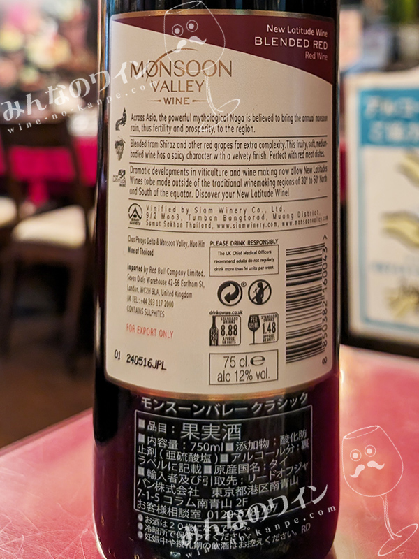 「モンスーン・ヴァレー」シリーズは、タイ国内の高級ホテルで採用されているほか、世界十数か国に輸出されている人気ワインシリーズです。