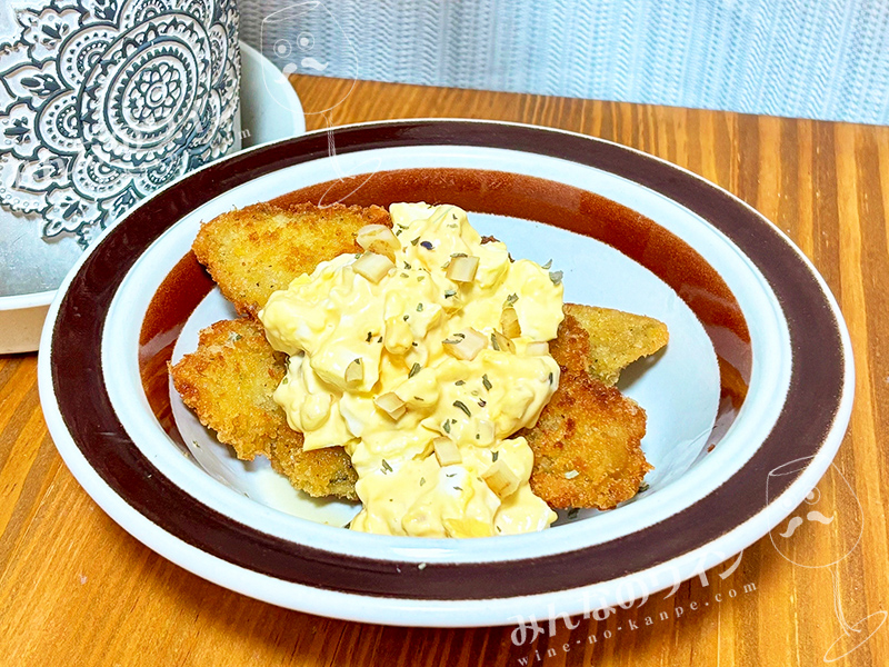白身魚のフライに、みじん切りにした白ワインごぼうピクルス入りのタルタルソースをのせました。