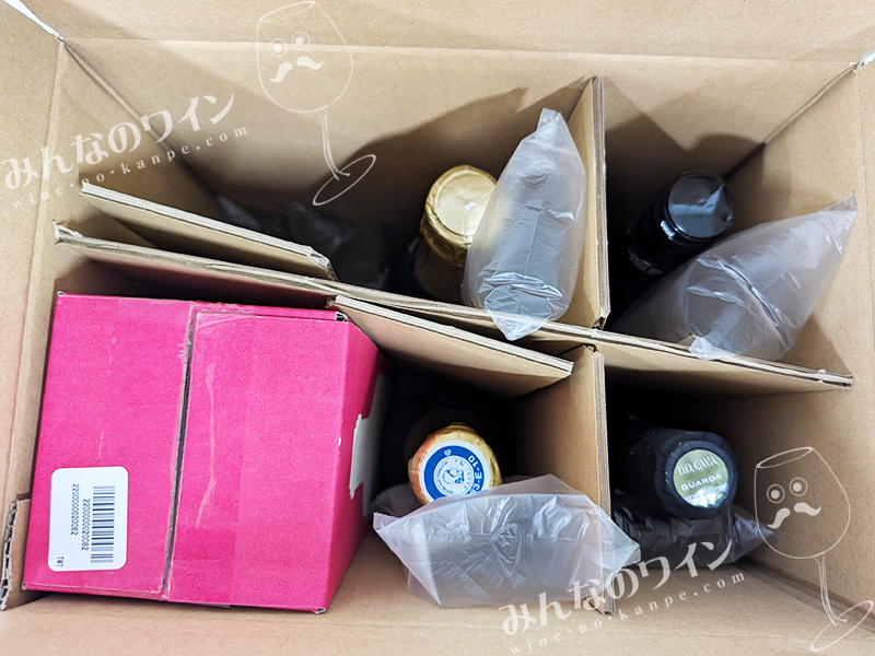 蓋を開けると、当選ワインが入った箱が1つと、スパークリングワイン4本が見えます。