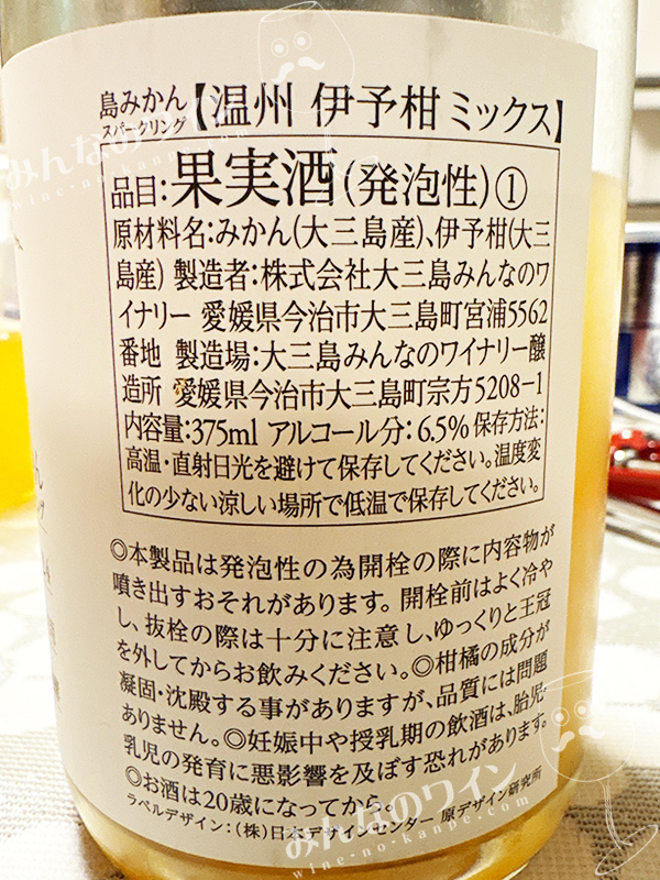 大三島産の伊予柑と温州蜜柑を使用し瓶内二次発酵で仕立てたスパークリングワインです。
